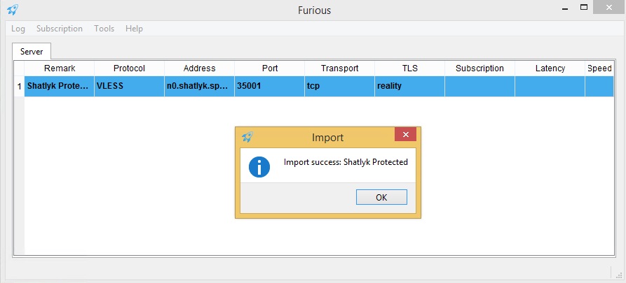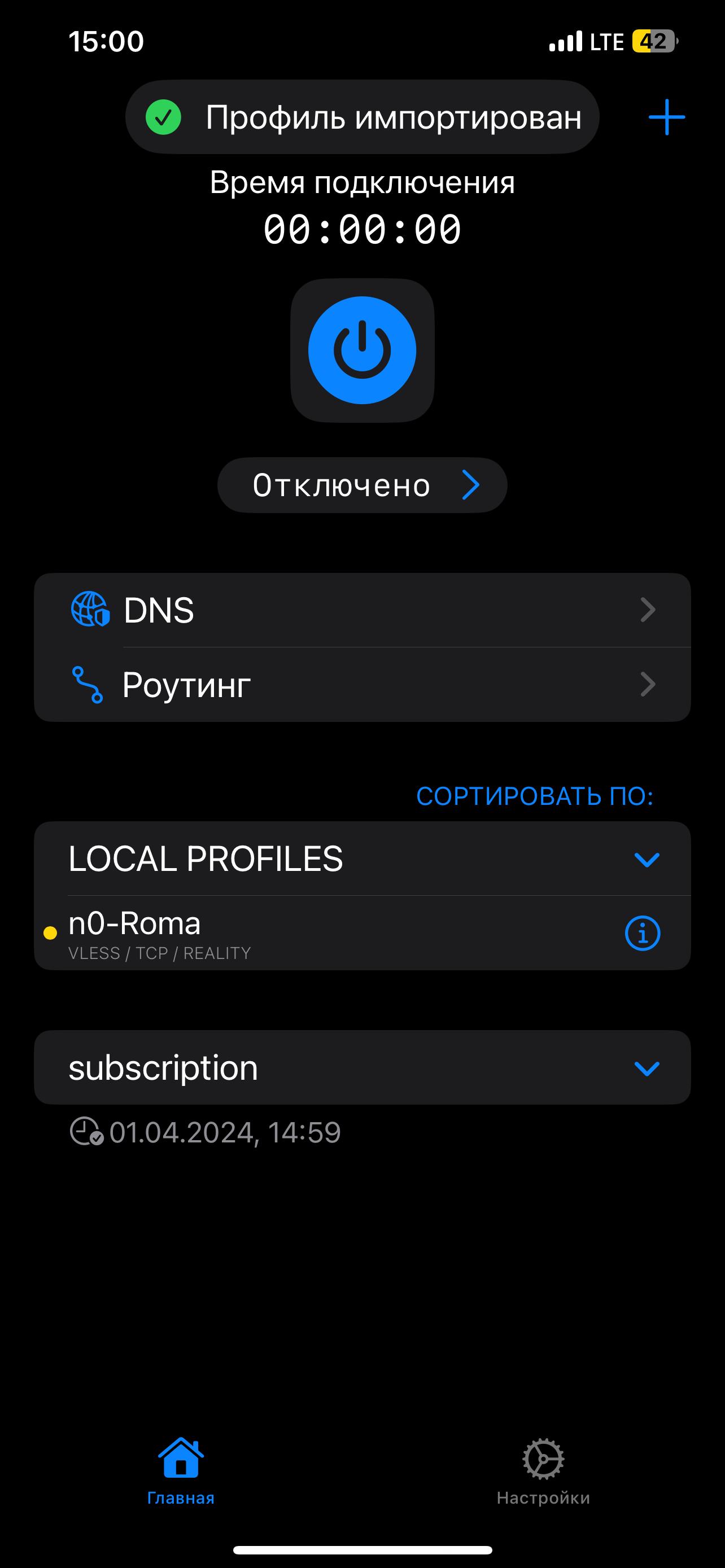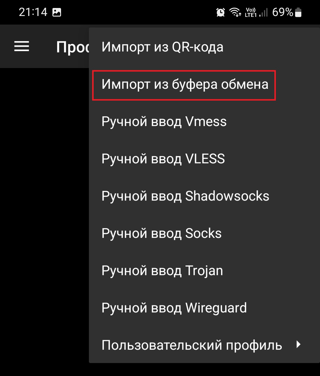 - В главном окне приложения нажмите на "+" и выберите пункт "Импорт из буфера обмена". Так же можно выбрать "Импорт из QR-кода" и навести камеру на QR код, полученный от телеграм бота. Готово, подключение добавлено. Для подключения\отключения используйте кнопку "V"