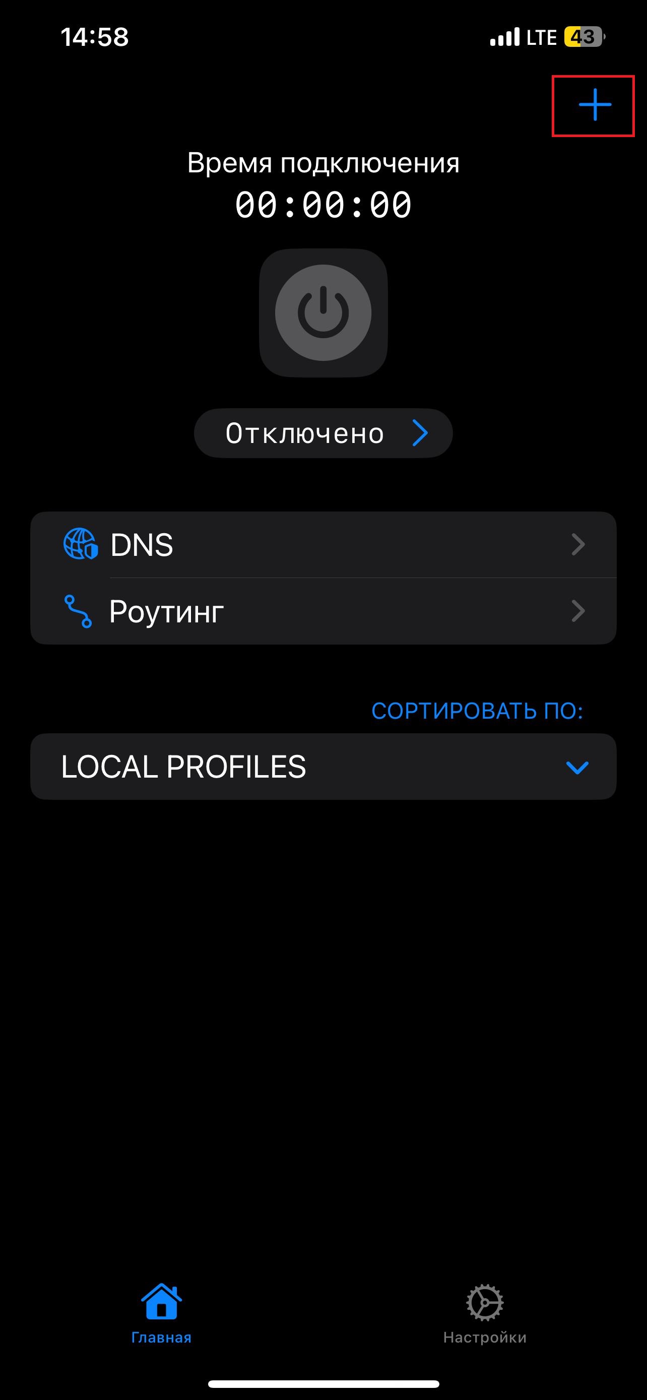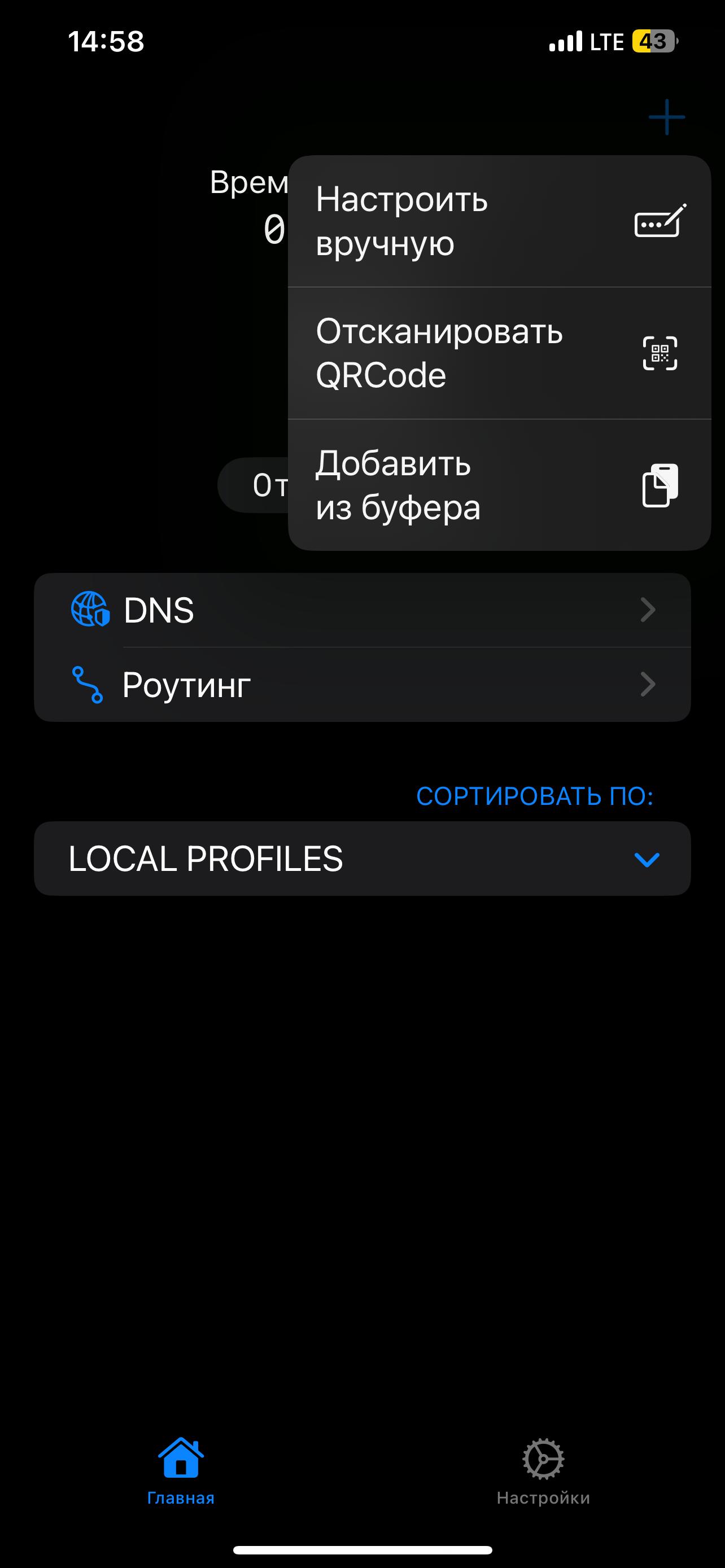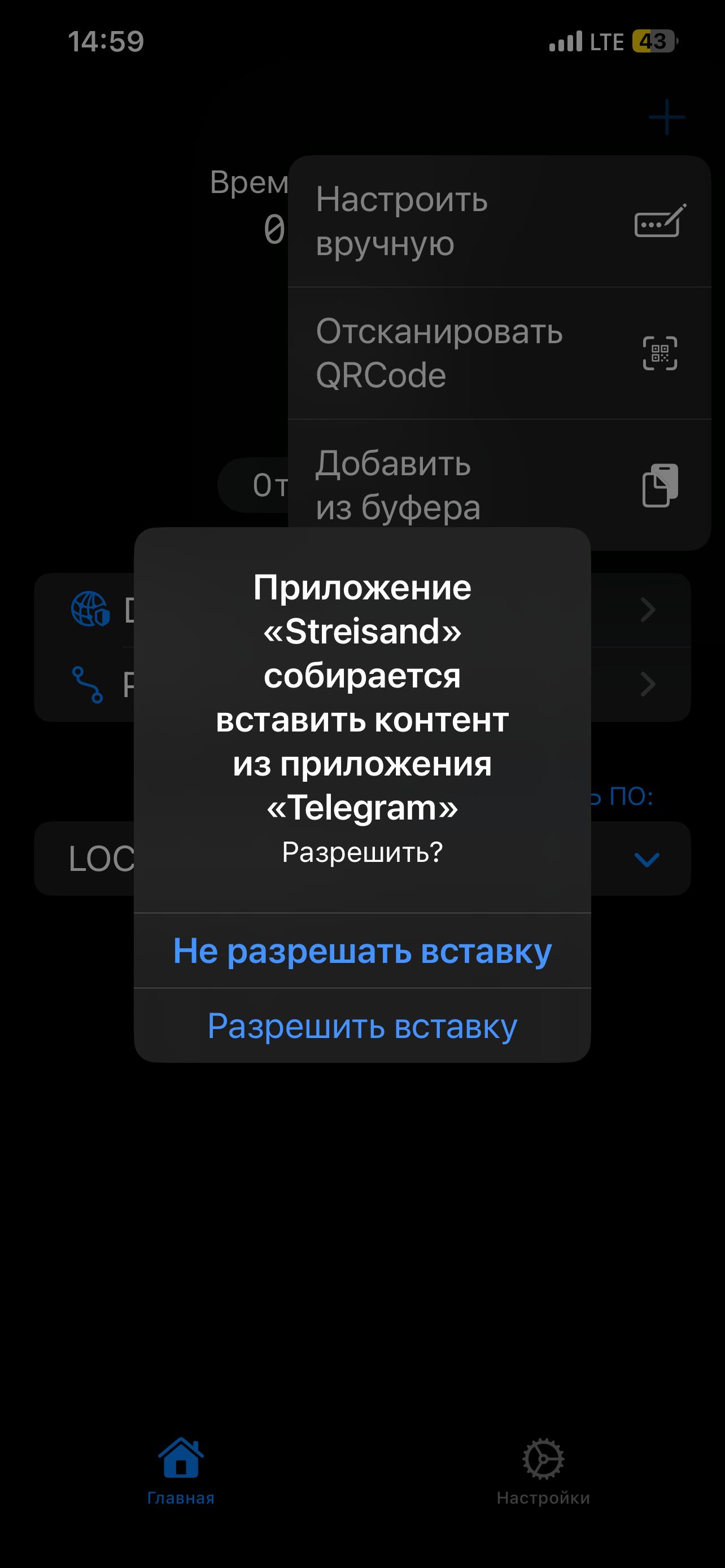 - В главном окне приложения нажмите на "+" и выберите пункт "Добавить из буфера обмена". Так же можно выбрать "Отсканировать QRCode" и навести камеру на QR код, полученный от телеграм бота. Готово, подключение добавлено. Для подключения\отключения используйте кнопку в верхней части главного окна приложения.