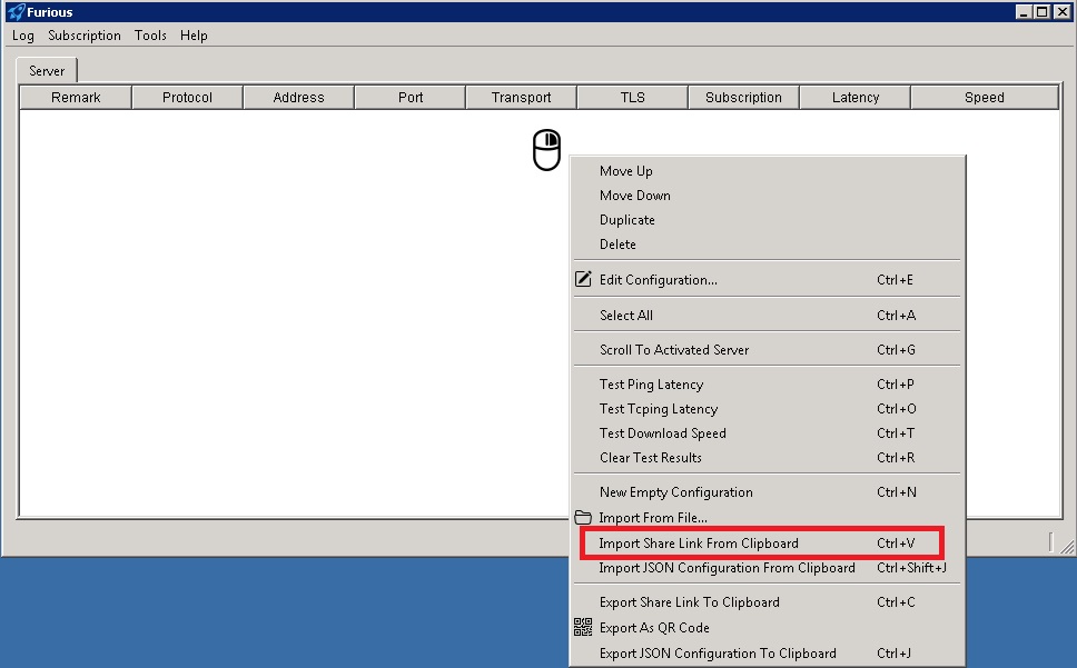 - В главном окне программы нажмите правую кнопку мыши и выберите пункт "Import Share Link From Clipboard" или нажмите сочетание клавиш Ctrl + V