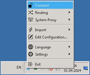 - Для подключения/отключения нажмите правую кнопку мыши на иконке программы в трее и выберите пункт Connect/Disconnect